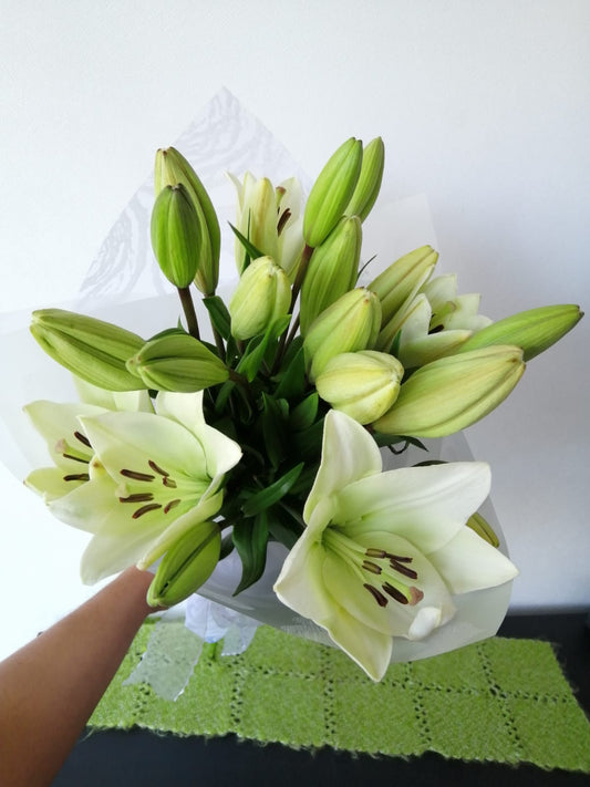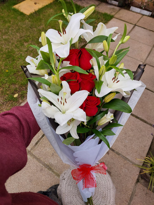 Ramo 6 Rosas Ecuatorianas Rojas y 5 Liliums Asiáticos Blancos en Escalera