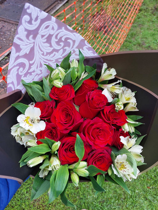 Bouquet 12 Rosas Ecuatorianas Rojas y 10 Alstroemerias