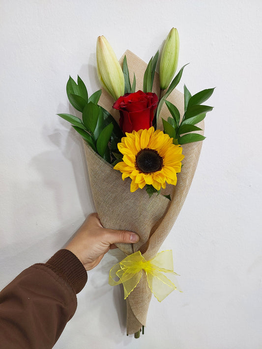 Ramo Rosa Ecuatoriana, Girasol y Lilium en Arpillera con Bombones