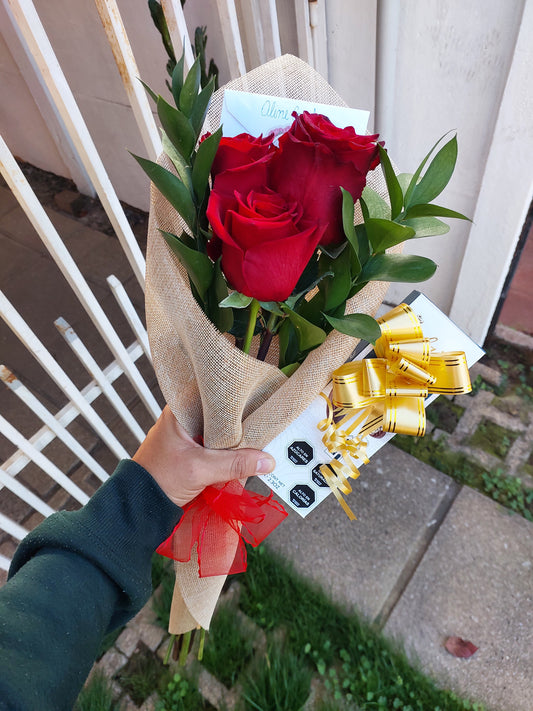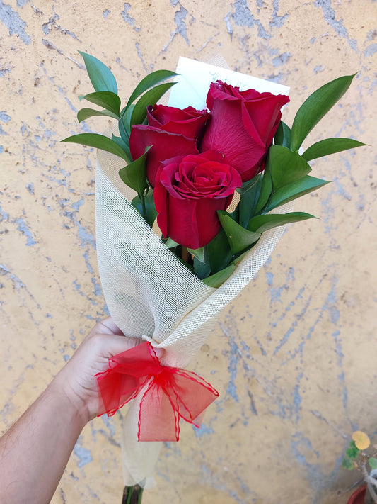 Ramo de 3 Rosas y 2 Ruscus en Arpillera