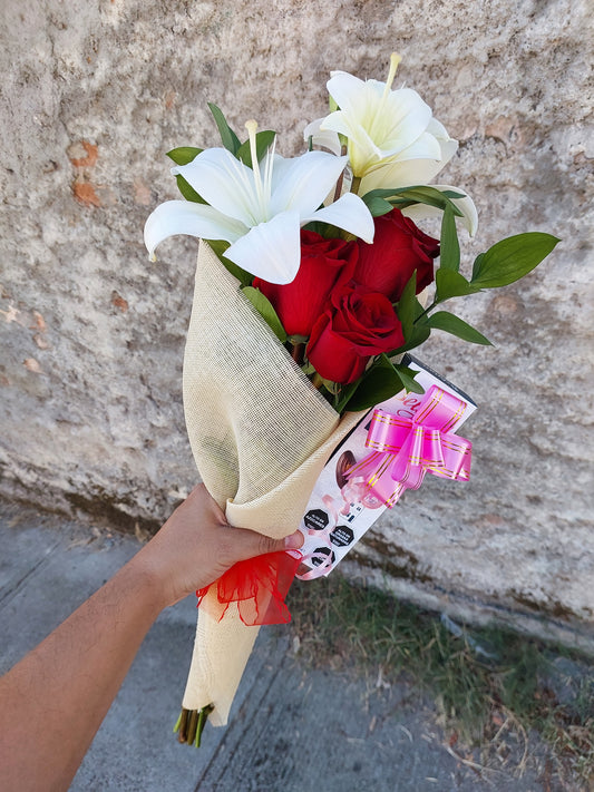 Ramo 6 Rosas Ecuatorianas y 5 Liliums en Escalera