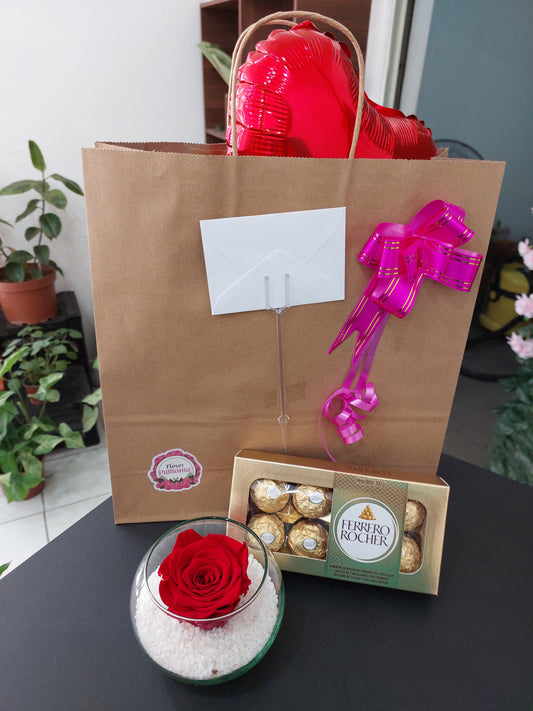 Rosa Roja, Ferrero Rocher y Globo Metalizado - Rosa Natural Preservada