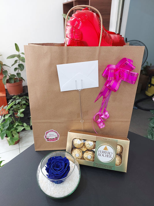 Rosa Azul, Ferrero Rocher y Globo Metalizado - Rosa Natural Preservada