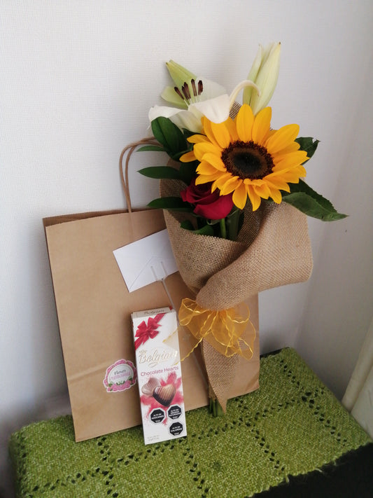 Ramo Rosa, Girasol y Lilium en Arpillera con Bombones