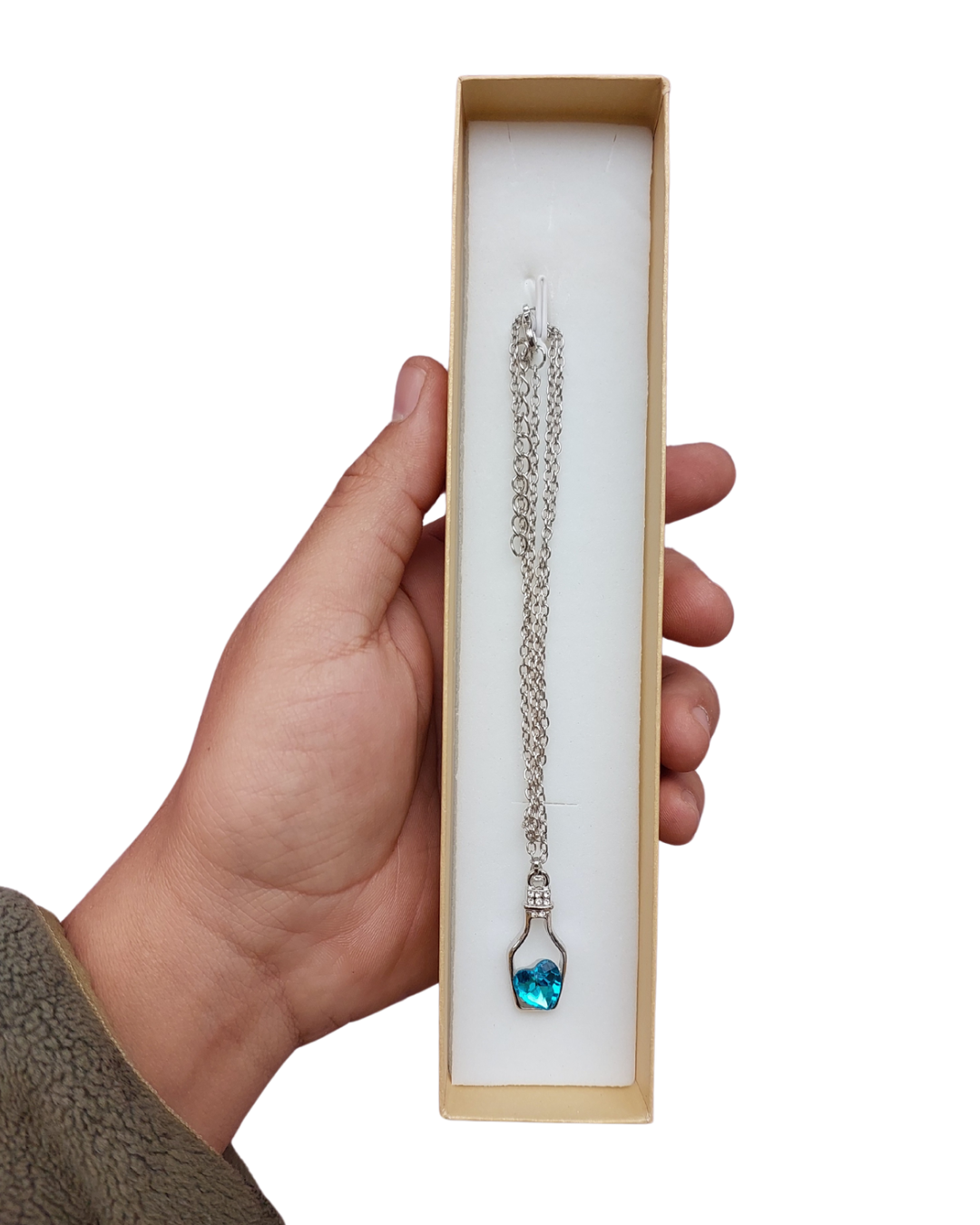 Hermoso collar con forma de botella y un corazón de fantasía.