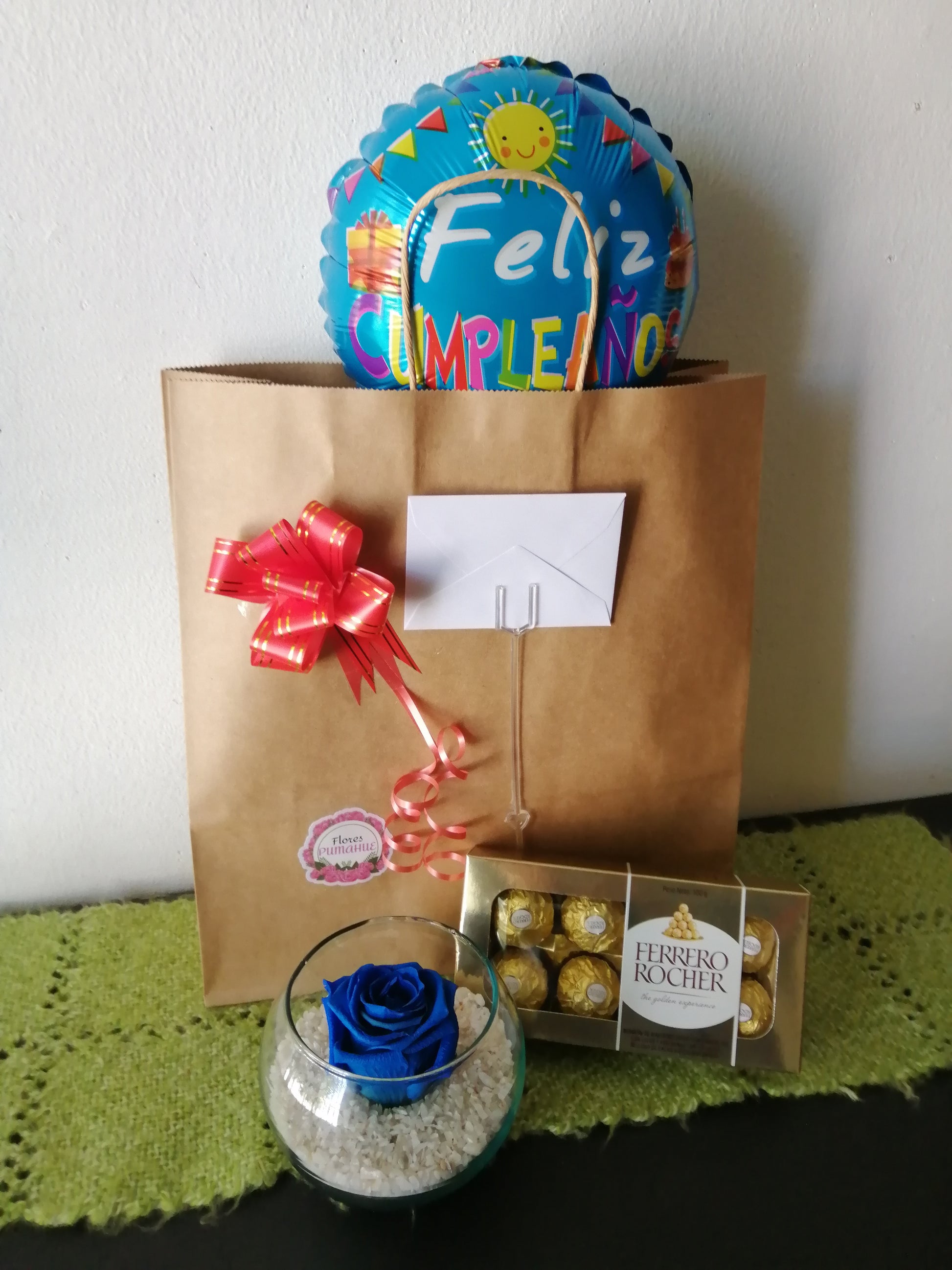Esta promoción incluye una rosa eterna sobre cuarzo en pecera individual + bombones Ferrero Rocher de 8 unidades y globo a elección